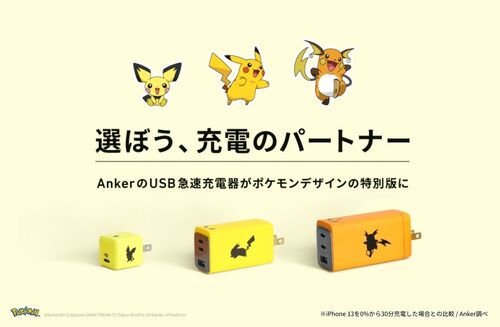 アンカー・ジャパンは10月27日、「ポケモンデザイン版USB急速充電器」として「20Wピチューモデル」「65Wピカチュウモデル」「120Wライチュウモデル」の3つのモデルを11月10日より公式サイト等にて販売することを発表した。 販売価格は「20Wピチューモデル」…