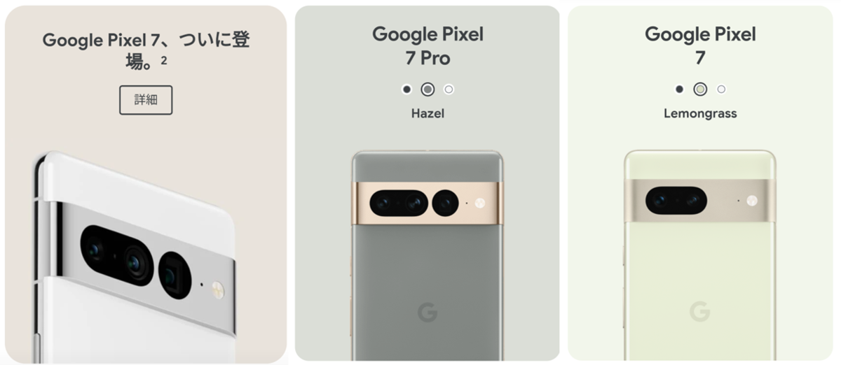 Pixel 7シリーズはGoogle Tensor次世代プロセッサおよびAndroid13搭載。Pixel 7は2眼カメラ・Pixel 7 Proは3眼カメラということがわかる。